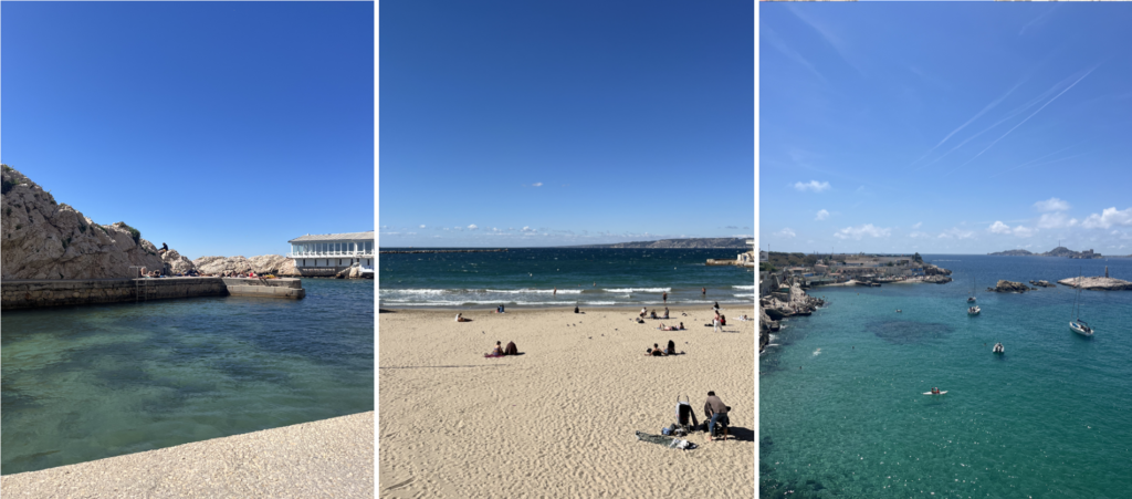 Marseille ligt direct aan zee, en daarom is het heerlijk om na een wandeling door de stad, of voor Les Marseillais na een drukke werkdag, een duik te nemen. Dat kan op een heleboel plekken, die allemaal aan de kustweg La Corniche Kennedy liggen. Er zijn een aantal stranden in Marseille. Over het algemeen is de kust van Marseille rotsachtig, de meeste inwoners vleien zich dan ook neer op de rotsen of een kiezelstrand. Zandstranden zijn er ook, op drie plekken. En voor wie op zoek is naar een brede kustlijn vol zandstrand, kan die gemakkelijk vinden in de omgeving van Marseille.